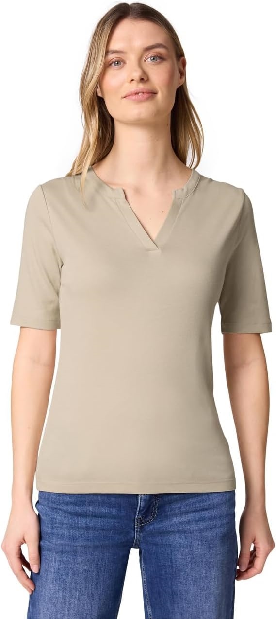 Das Jersey T-Shirt von Street One für Damen begeistert mit lässigem Split Neck, kurzen Ärmeln und softer Qualität im Baumwoll-Modalmix. In Unifarbe gehalten, ist es ein vielseitig kombinierbarer Begleiter für deine Alltagslooks. Ob unter Blazer, Cardigan oder solo getragen dieses Shirt passt immer.