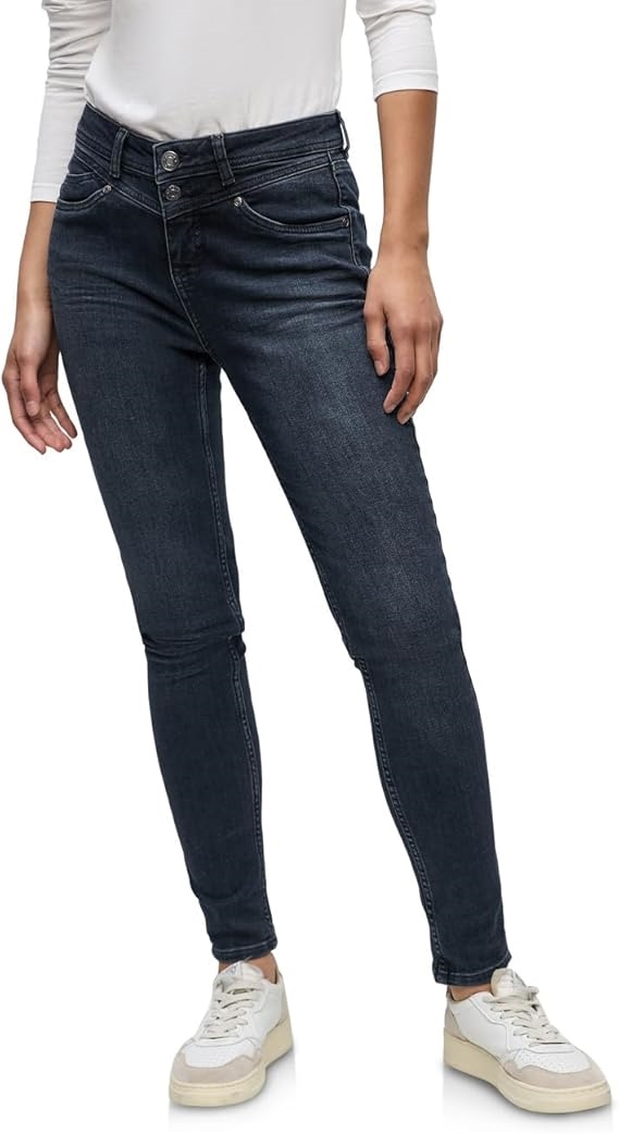 Die Jeans im Style York von Street One für Damen begeistert mit Slim Fit, High Waist und einer edlen schwarzblauen Waschung. Der softe Baumwollmix mit Stretchanteil sorgt für ein angenehmes Tragegefühl. Trage die Jeans figurbetont oder wähle eine Nummer größer für einen entspannteren Look.