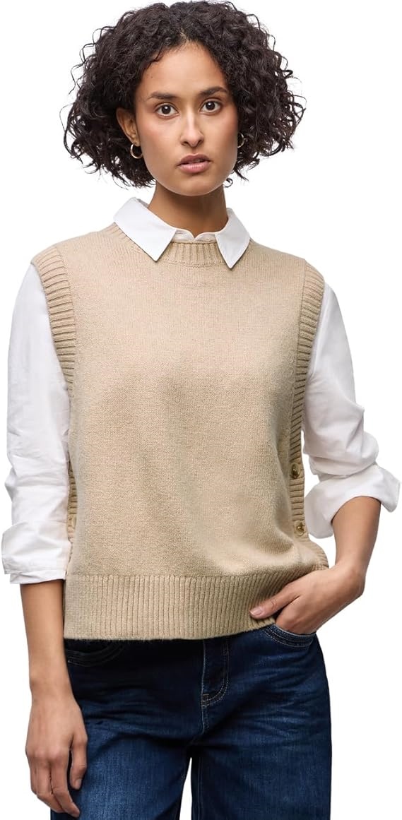 Der ärmellose Pullover von Street One für Damen ist ein echtes It-Piece für kreative Layering-Looks. Seitliche Knöpfe setzen stylische Akzente und geben dem Pullunder eine besondere Note. Die weiche Qualität und der klassische Rundhalsausschnitt machen ihn zum vielseitigen Begleiter.